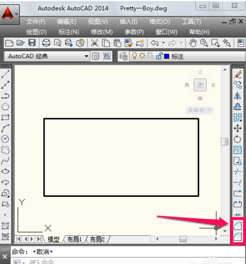 3、使用矩形工具在绘图区里绘制一个矩形,然后在右侧找到倒角命令