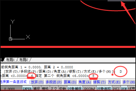 2、选择倒角工具后输入“d”(设定倒角距离),然后按回车确定。