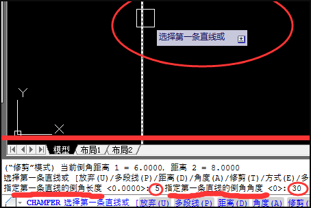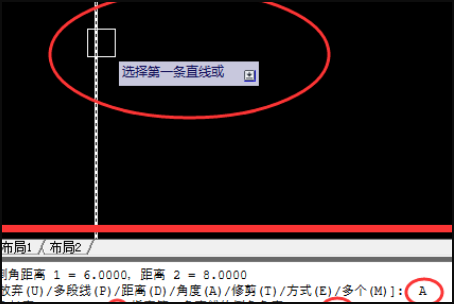 4、参数角度A:选A确认,指定第一条线的倒角长度5,回车键或空格键确认,