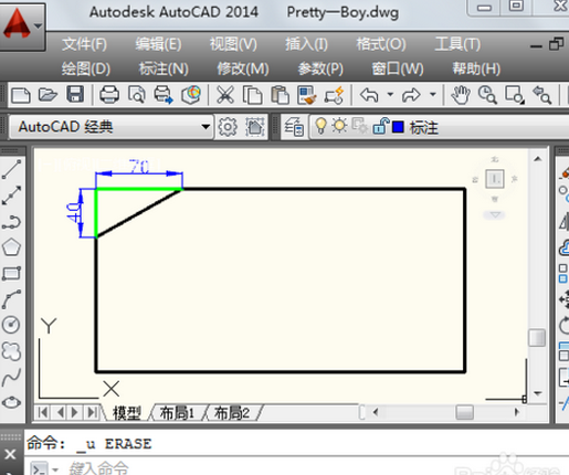 4、这时点击图形中第一条线(倒角距离为70)和第二条线(倒角距离为40)。此时cad倒角就已经画好了,用绿色线补齐然后标注尺寸给大家看一下。