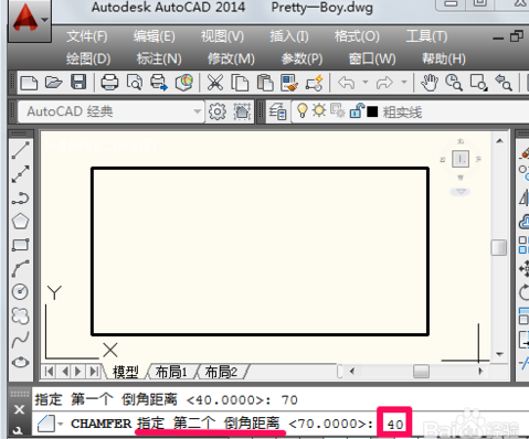 3、输入第一个倒角距离,这里输入70,按回车键确定。输入第二个倒角距离,这里输入40,按回车键确定。