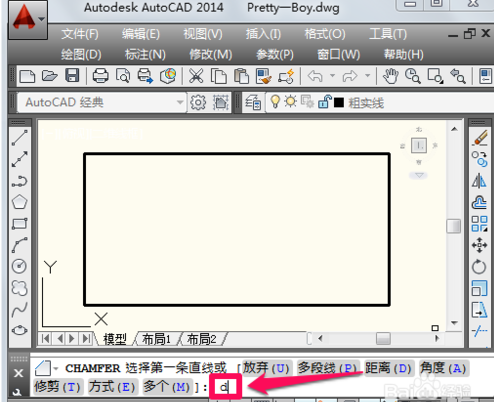 1、单击【修改】工具栏中的【倒角】按钮或者命令行:在命令行中输入CHA。