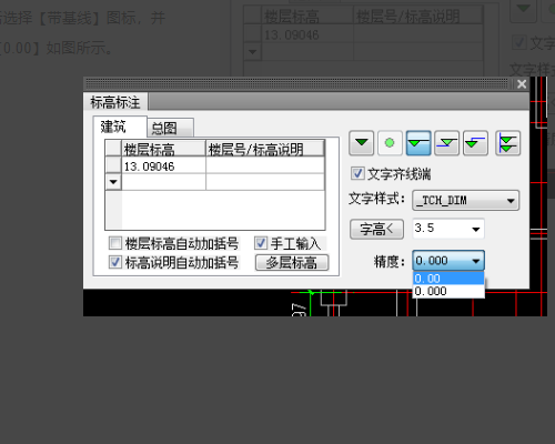 3、接着从【标高标注】选项中勾选【手工输入】复选框,在【楼层标高】列表中,输入所需标高值,然后选择【带基线】图标,并将【精度】设为【0.00】如图所示。