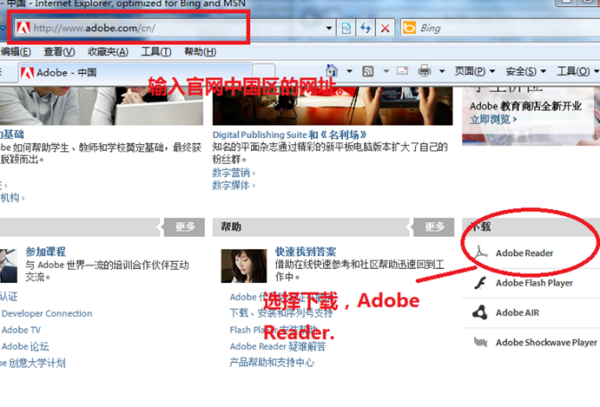 1、首先打开浏览器,前往到Adobe中国的页面,页面打开后,下拉页面至最底部,在下载区域选择Adobe Reader。