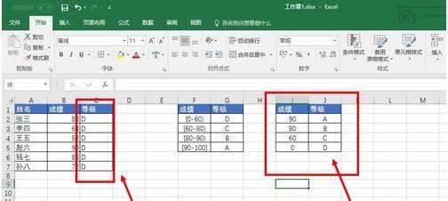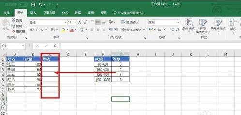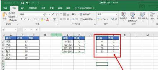 2、首先,构建一个范围,因为[0-60)为D,则0设为D,[60-80)为C,则设置60为C,以此设置B和A,如图。