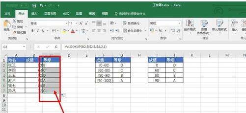 4、输入VLOOKUP函数,其中参考值为B2,查找区间为我们构建的范围($I$2:$J$5)(绝对引用),列数为2,选择模糊查找(1),因此公式为“=VLOOKUP(B2,$I$2:$J$5,2,1)”。