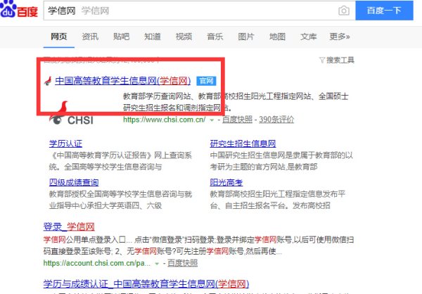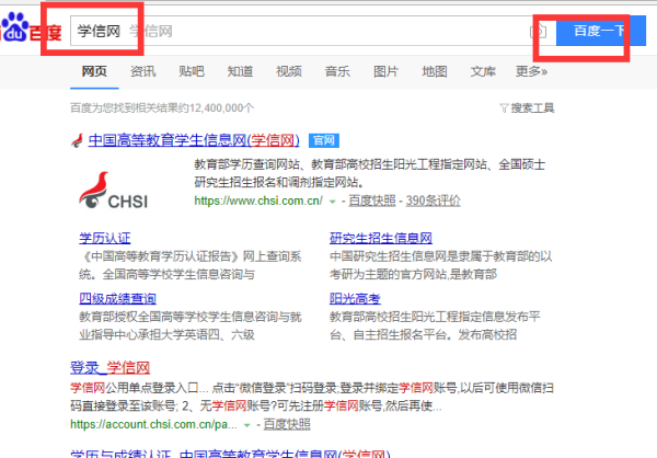 1、打开一个浏览器,在百度中输入“学信网”,单击“百度一下”
