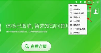 2、进入到卫士页面以后,我们在顶部的菜单栏中找到如图的小三角形按钮,点击按钮,会弹出一个新的下拉框,在下拉框中点击设置。