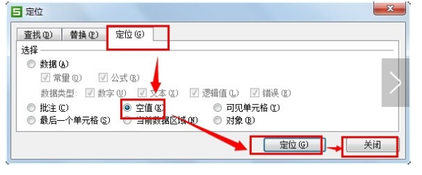 4.选择定位----空值----定位---关闭。我们发现原来的数据表空白单元行都被定位出来了。