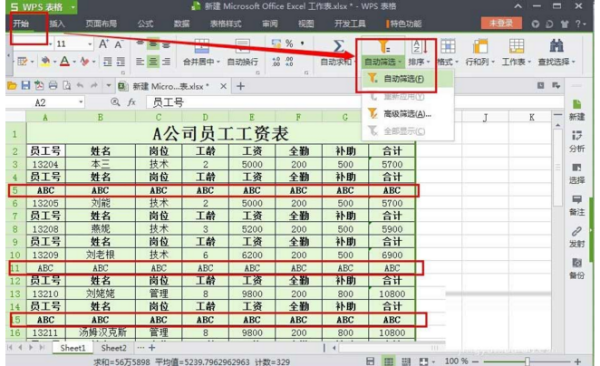 6.这时候我们发现原来表格的空白处单元格都已经被替换为ABC的内容了。我们选择表格A-H列----开始---自动筛选。