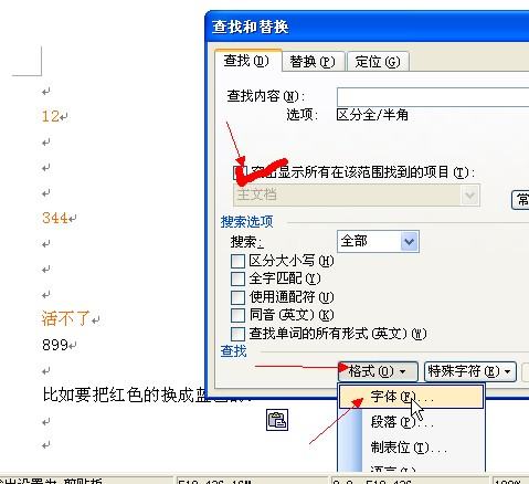 4、再点击“替换为”--格式--字体,设置为白色(也就是页面背景的颜色),这样等于留空效果。