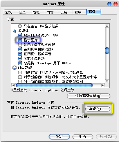 如果网页不显示图片的问题仍然没有解决,需要手动检查浏览器设置。打开浏览器,点击菜单栏上的工具-Internet选项,点击“高级”选项卡,查看“多媒体”一栏是否选中必要的选项(我们也可以通过点击下方的“重置”按钮还原浏览器的默认设置,可解决因设置问题引起的网页不显示图片问题)。