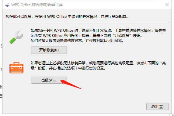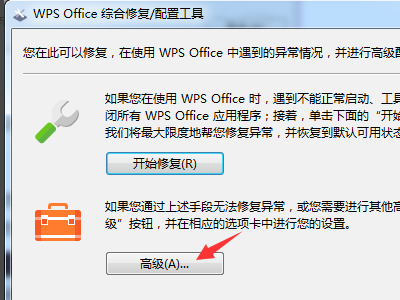 3、这时,电脑将弹出一个WPS Office综合修复/配置工具窗口,点击高级。