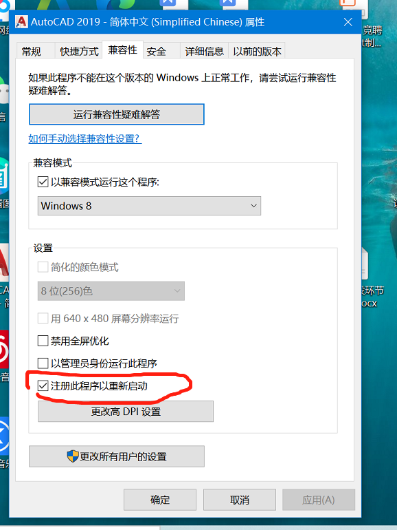 右键选中CAD,选择属性,兼容性 将注册此程序已重新启动勾选,就可以了
