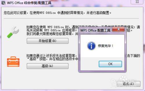 点开配置工具后,点击开始修复,如果此时开着WPS修复的话,会出现提示,需要把WPS关闭后,才能修复。等一下下,就会弹出修复完毕的通知窗口了。