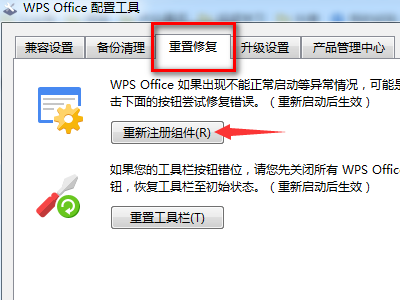 4、在弹出的WPS Office配置工具窗口中,点击重置修复选项卡,点击窗口下方的重新注册组件。