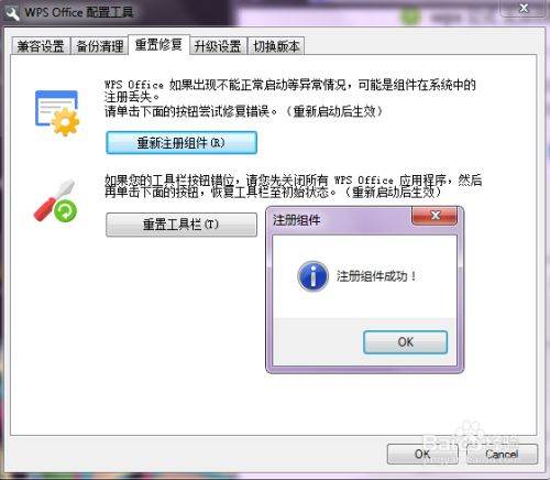 然后点击高级->重置修复,然后点击重新注册组件,等一会后,就会出现注册组件成功的提示。这一个操作后,需要重启电脑才会生效。