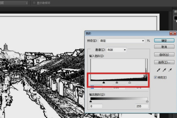 4、参考第二步,再打开色阶面板使线条边缘黑白对比更加明显。