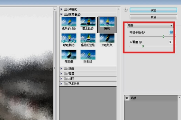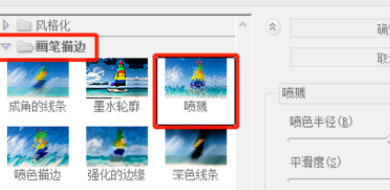 8、执行 <滤镜 - 滤镜库>,打开滤镜库, 选择 "画笔笔划"-"飞溅", 将喷雾颜色半径设置为 15, 平滑9。