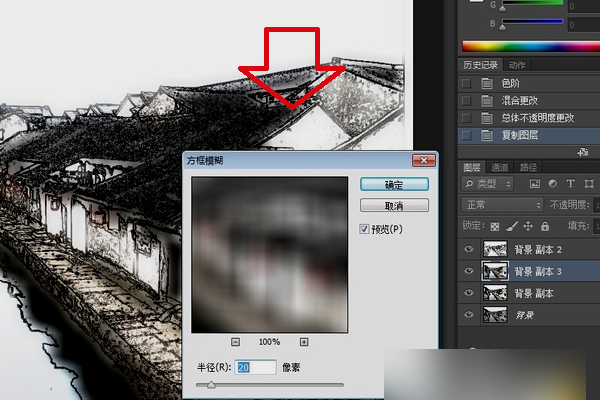 6、再将处理过的背景副本层复制一次,在滤镜菜单中执行“模糊--方框模糊”命令,设置合适的半径,使照片出现一种朦胧的感觉。