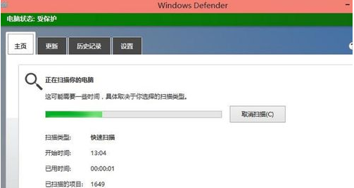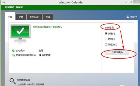 3、这样就开启了win10自带杀毒软件windows defender,扫描选项选择“快速扫描”,单击“立即扫描”。
