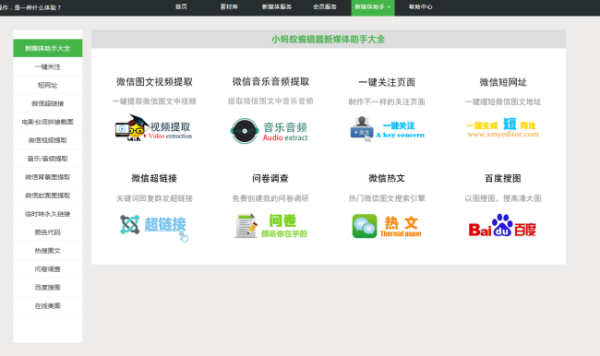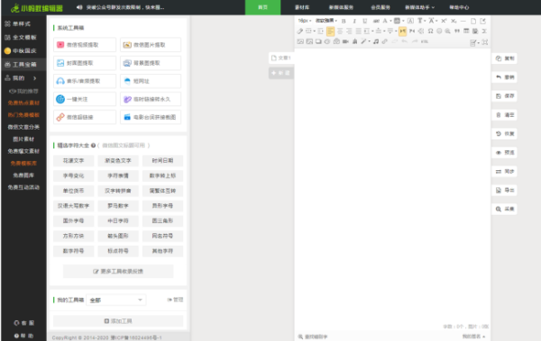 这个微信编辑器目前拥有微信文章排版样式10W+,涵盖100+行业专题模板,不同风格不同类型,新增新媒体运营工具箱,其中包含各种新媒体运营工作者常用的工具,简单高效。系统工具箱中有10种小工具,微信文章视频提取,微信文章图片提取,微信文章背景图提取,微信图文音频视频提取,短网址,一键关注,临时链接转永久链接,微信超链接生成,电影台词拼接截图等;