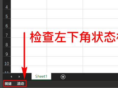 2、按下方向键进行移动时,如果不能选择单元格,检查一下在excel软件的左下方状态栏是否出现了“滚动”字样。