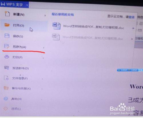 弹出WPS文字菜单,点击另存为