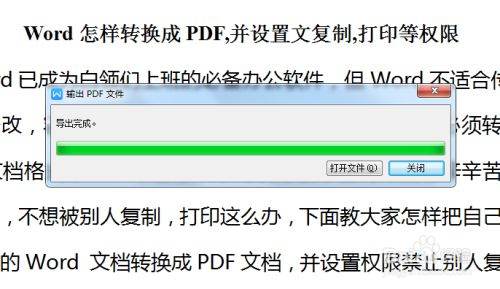 弹出输出PDF文件对话框,等导出完成后,点击关闭或打开文件,到处PDF权限设置完毕