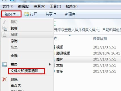 2、打开“计算机”,点击“组织”打开菜单,选择“文件夹和搜索选项”;