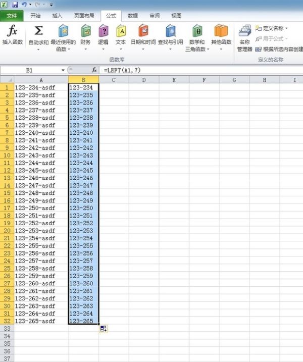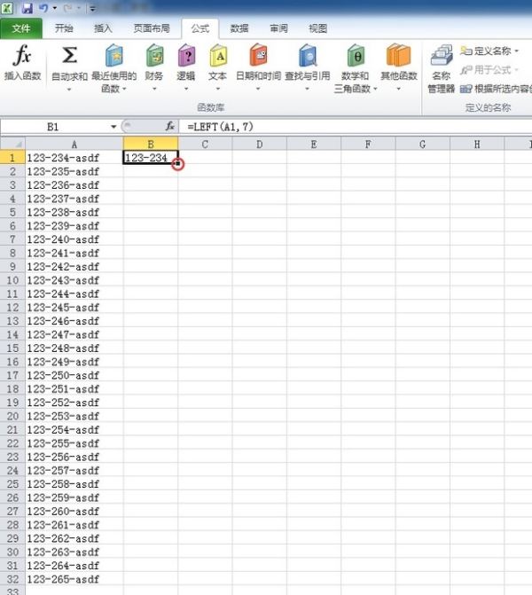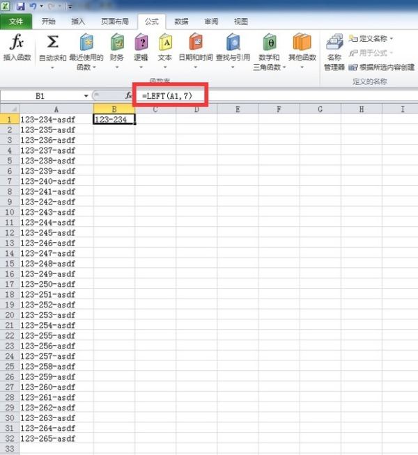 2、在选择的单元格中输入=left(a1,7),这样就只取前面7个字符,数字后面的就不会有了