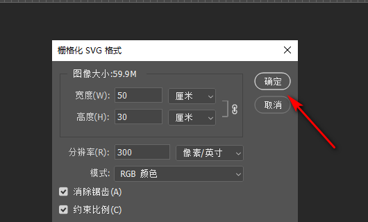 3、点击打开后,弹出栅格化窗口,点击确定。