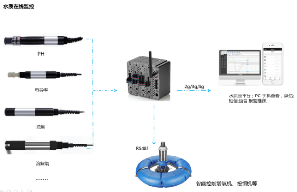 主要由水质传感器、无线数据采集器、水质监控云平台等三部分组成。水温、PH值和溶解氧等通过无线数据采集器传至云平台,实现水质环境24小时实时监控,云平台数据存储,历史曲线查看,当检测数据出现异常时,会及时推送报警信息并且通过无线采集器对增氧泵控制,循环泵控制,以及投料机控制。