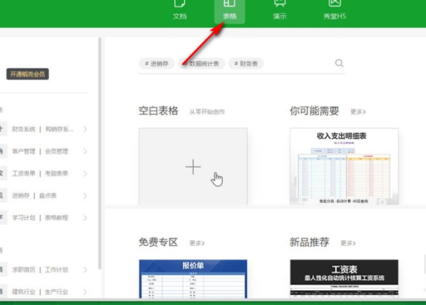 6、选择新建一个空白表格文档,也可以新建word文档和ppt文档。
