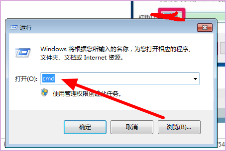 2、然后在弹出来的窗口中点击输入“cmd”,回车确定。