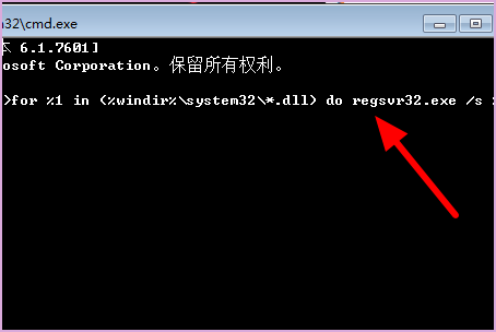 3、然后在弹出来的窗口中点击输入“for %1 in (%windir%\system32\*.dll) do regsvr32.exe /s %1”,回车确定。