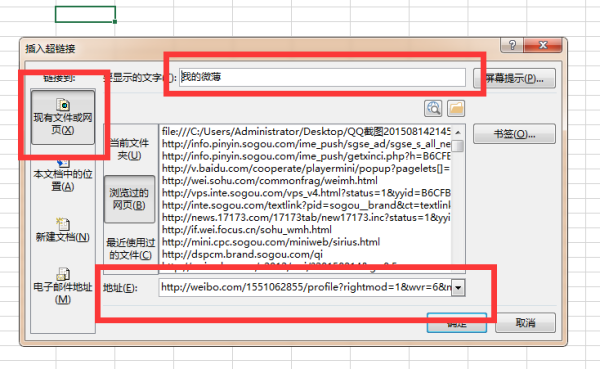 2、在插入超链接对话框里,选择现有文件或者网页,然后在地址栏将地址粘贴过来。在要显示的文字里,可以默认链接的形式,也可以给这个链接起个名字,比如:我的微薄。