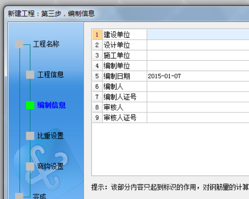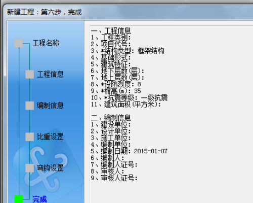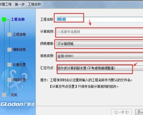 1、打开软件。输入工程名称,输入对应的计算规则,汇总方式等等,鼠标点击下一步。