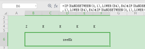=IF(RANDBETWEEN(0,1),LOWER(B4),B4)&IF(RANDBETWEEN(0,1),LOWER(C4),C4)&IF(RANDBETWEEN(0,1),LOWER(D4),D4)&IF(RANDBETWEEN(0,1),LOWER(E4),E4)&IF(RANDBETWEEN(0,1),LOWER(F4),F4)