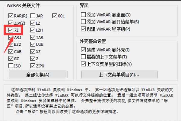 4、安装完成后在“WinRAR关联文件”中找到“7Z”这一项并将这一项选中,这时7z格式的文件就能被winrar解压了: