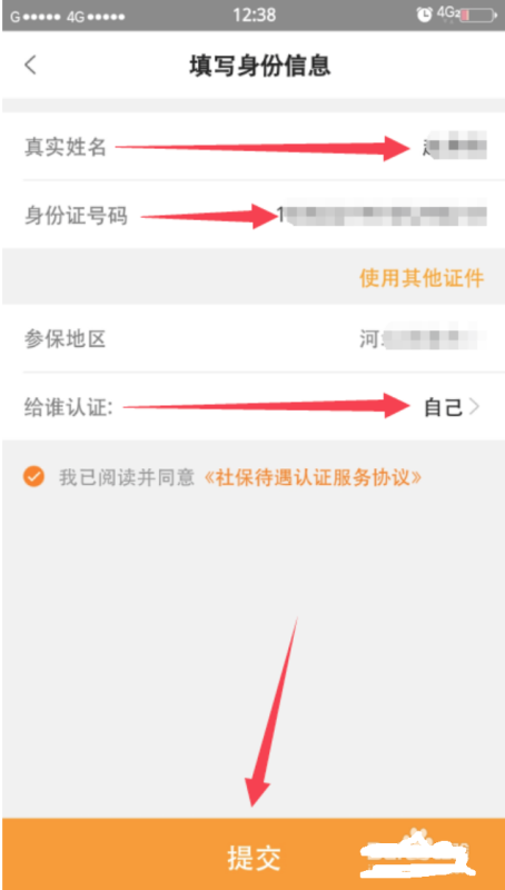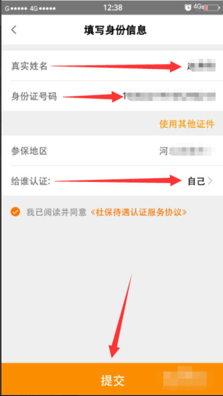4、填写身份信息,包含姓名、身份证号和给谁认证,点击提交。