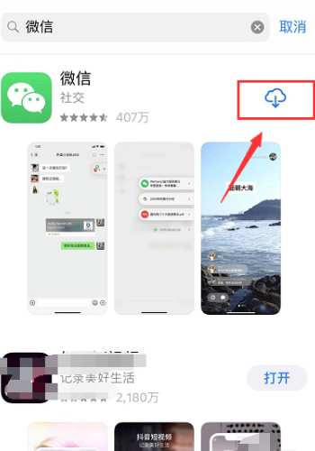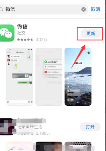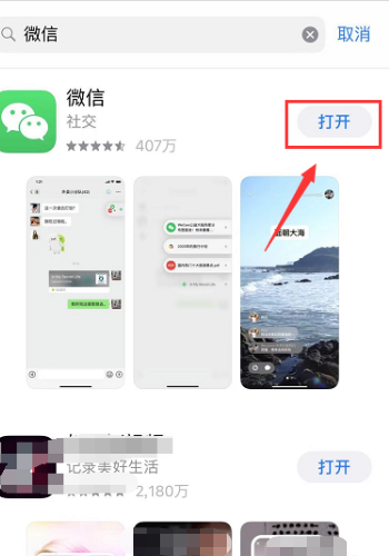6、然后进入app store,搜索进入微信app界面,点击打开按钮,重复第5步,第6步,一般三次就可以看到更新按钮了,
