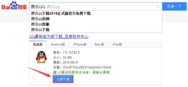 1、首先从百度首页上搜索腾讯QQ,然后点击下方的【立即下载】按钮.