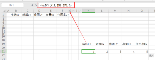 点击K21单元格,输入:=MATCH(K19,$B1:$F1,0),按enter键结束,然后向右拉动。