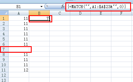 =MATCH("",A1:$A$23&"",0)注意:是数组公式,需要以 ctrl +SHIFT+ 回车输入公式。
