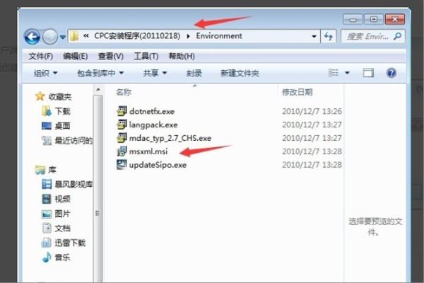 2、第二步,执行完上面的操作之后,找到安装包,在环境文件夹中找到“msxml.msi”文件,然后双击运行该文件,见下图,转到下面的步骤。