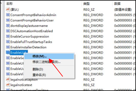 5、右键单击“EnableLUA”,在弹出的浮动菜单上选择“修改”;