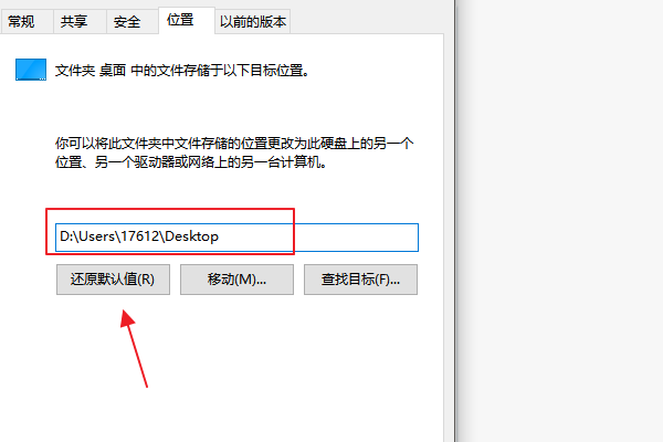 5、然后可以看到此时的地址是D盘,点击下方还原默认值。