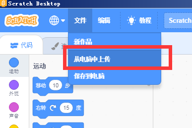 选择Scratch3.0编辑器主菜单->文件->从电脑中上传,即可打开文件选择窗口,然后选择要打开的Scratch文件,点击“确定”即可。