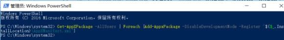 $manifest = (Get-AppxPackage Microsoft.WindowsStore).InstallLocation + '\AppxManifest.xml' ; Add-AppxPackage -DisableDevelopmentMode -Register $manifest